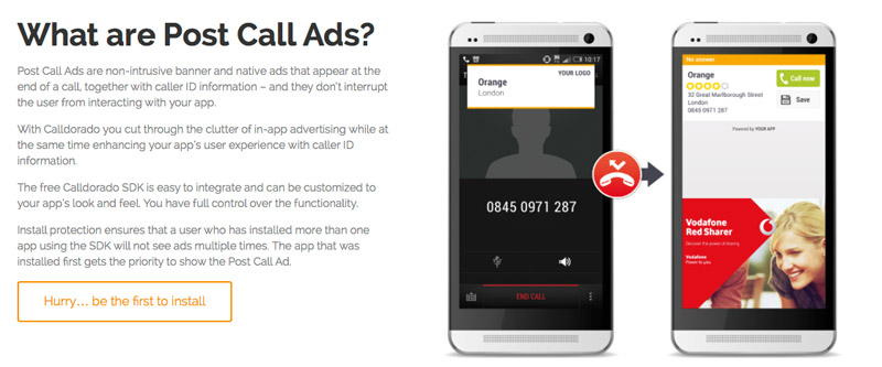 Today I received the scariest advertisement offer to date. The offer if I understood it correctly, centres around placing ads after a user places a call based on their last number dialled. I assume with the number they can get a general sense of area and interest, specially if you are calling a business. So the basic idea is you install a game, and there are no ads in the game, but you get an ad after each phone call. The company offering this is http://www.calldorado.com/
